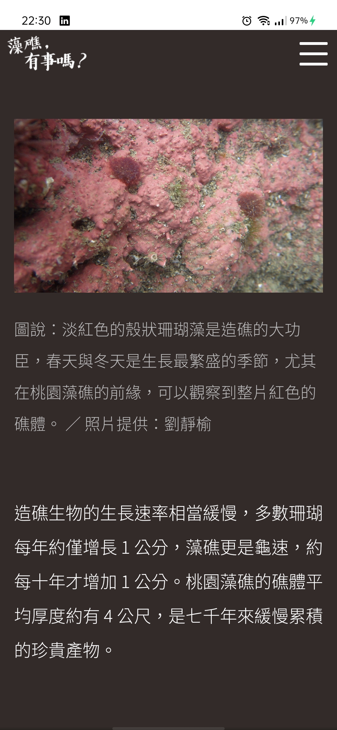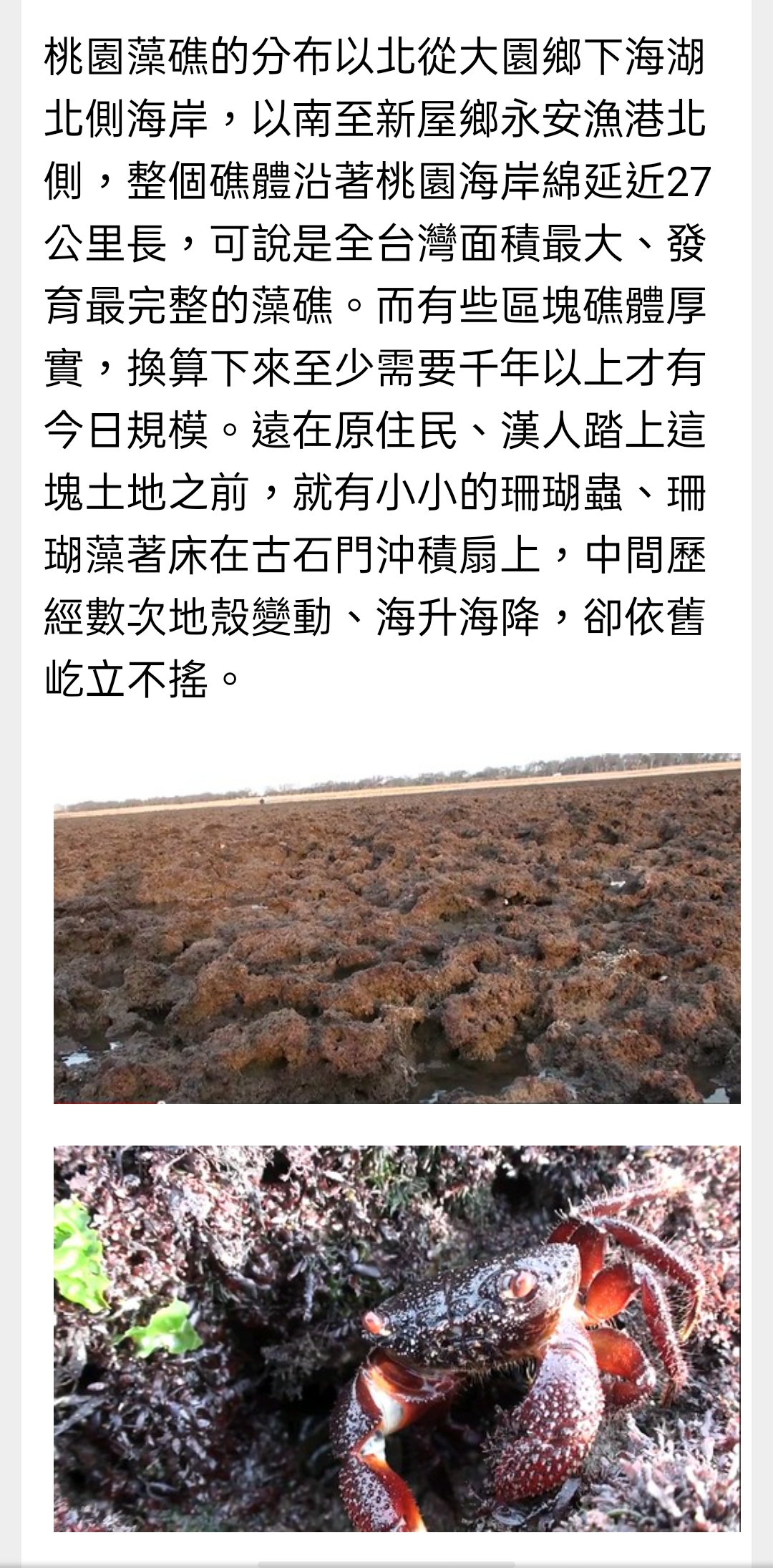 珊瑚一年長一公分,是動物很珍貴。島礁10年長一公分,是藻類的堆積更珍貴,桃園大園的島礁已經7600年了,是沿岸動物魚類的棲息地,跟高美濕地一樣很重要。