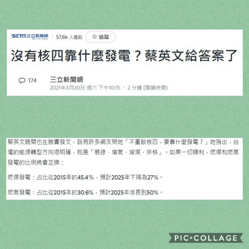 當世界各國減碳有進展的時候,到時候碳排放高的國家,產品或許會該碳稅,成本會更高,相信50%燃氣的規畫,絕對達不到世界的標準,但台灣的地理綠電也不可能太高,這是長遠但一定會發生的問題,蔡英文總統並沒有提出一個好的方法。