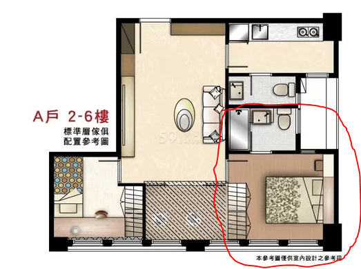 讓我們來看看顏發言人房子的平面圖( 紅框處為有浴室的房間 )。