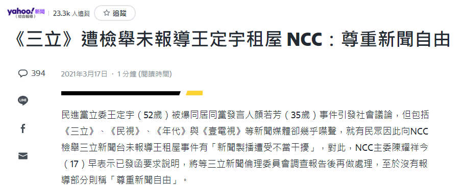 此事連結到的番外篇,就是此重大新聞(王定宇可是台南的金童啊),三立電視台支字未提被民眾向NCC檢舉。NCC行文請三立說明。