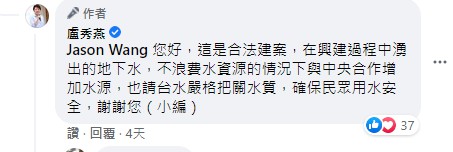 二,市中心的二處水源,勤美之森、老佛爺建案調撥工地地下水,並非新增的「鑿井」,而是合法建案,在興建過程中湧出的地下水,不浪費水資源的情況下與中央合作增加水源,也請台水嚴格把關水質,確保民眾用水安全。(依盧秀燕臉書官網回覆)