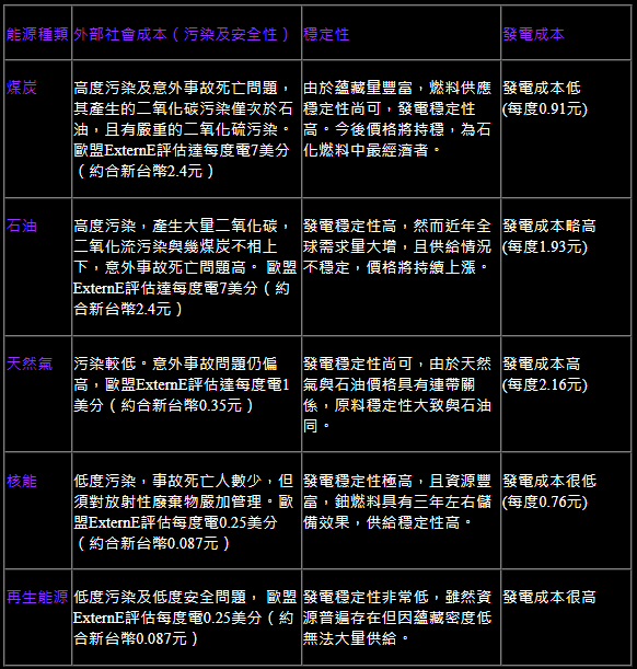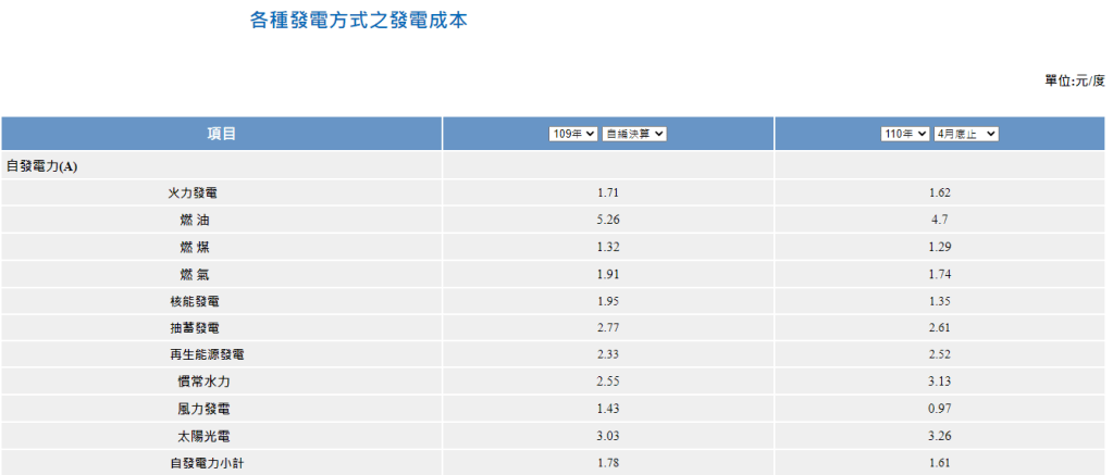 以下為台電列的,看起來很奇怪,怎麼可能煤跟天然氣差不多,核電也差不多?所以上表的參考性顯比下面的高。