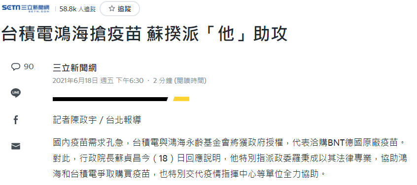 衛福部陳時中的上司蘇貞昌,在大家撻伐的時候神隱很多天,當郭董逼蔡英文同意通過授權買疫苗後,馬來跳出來說:因為他派了誰所以有助功?好一位曾在神明前發誓卻違背的蘇貞昌!
