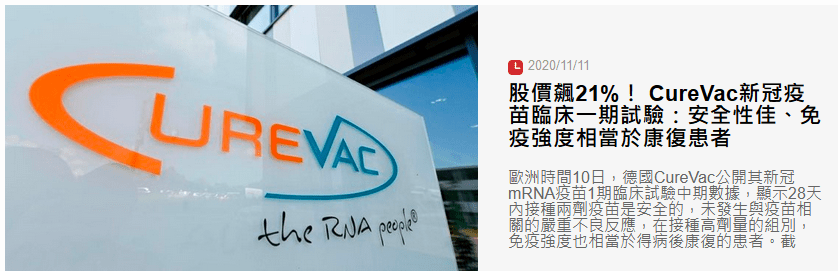 CureVac的新冠疫苗計畫獲得德國政府大力支持,德國政府在8月收購了該公司23%的股份,葛蘭素史克(GSK)也在7月以1.64億美元購買CureVac 10%的股份。CureVac也在8月完成2.13億美元的首次公開發行(IPO)。(https://store.gbimonthly.com/Article/Detail/52514?lang=zh-TW)