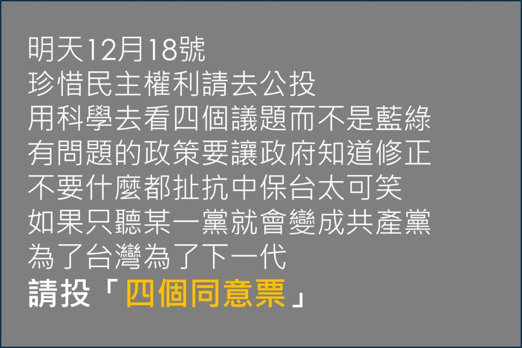 明天,12月18日,請大家有空就去公投,執行公民應盡的權利。
