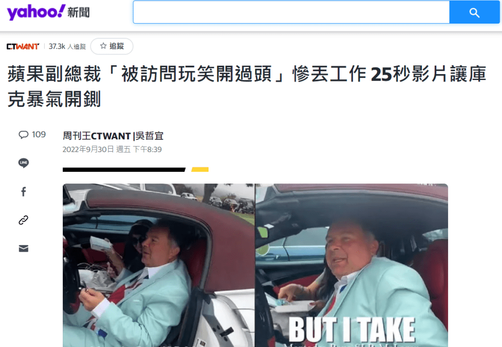 這應該算得上2022年引用失據前十大了,以地位、名氣、收入來看都絕對是人生勝利組的蘋果副總裁(名字也不用再記了…),其實原想引用"布萊文斯接受彭博社報導表示「我想藉此機會向那些因我錯誤的幽默,而感到被冒犯的人真誠地道歉」,他也稱自己當時是想引用1981年電影《亞瑟》(Arthur)的經典台詞「我賽車、打網球和撫摸女人,但我週末休假,我是我自己的老闆」。"但在沒有前提或是舖陳下,直接類比說出:「我擁有豪車,我打高爾夫、愛撫大胸女士,且周末和重大節日還不用上班」。