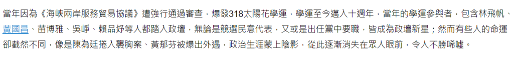 首先看看十年前的太陽花,不是性騷擾,就是色情仲介,官二代,因政治坐領高薪,婚外情,當初的抗爭沒有為台灣帶來了利益,只為自己及民進黨布下了後續自食惡果及貪污的種子。