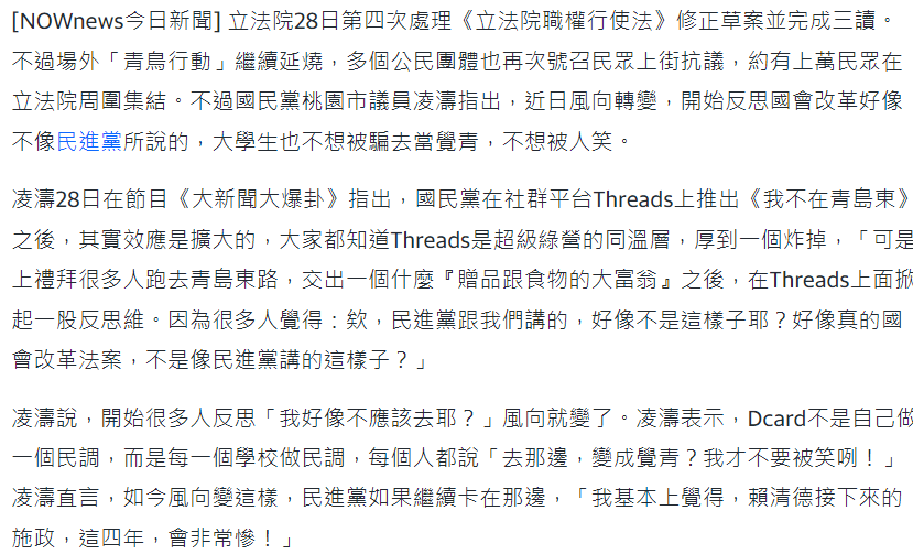 2024-05_真的很鳥的青鳥行動 分類:Librapolitics_時光點評26 七月, 202420 七月, 2024發表於時事政策,民進黨,不分類標籤:立院職權行使法修正案,青鳥,國會五法,年輕人的反思,民進黨,便當和飲料 讓我們看看此次他們反對的立院職權行使法內容: 來自品觀點 也就是時光點評說的國會五法改革: 當然,如果餓了,想吃綠油油的便當和飲料,就去當隻青鳥吧,吃完就飛倒是合情合理。 分享此文: 分享到 Facebook(在新視窗中開啟) Facebook 分享到 X(在新視窗中開啟) X 更多 Share on LinkedIn(在新視窗中開啟) LinkedIn 分享到 Telegram(在新視窗中開啟) Telegram Email a link to a friend(在新視窗中開啟) 電子郵件 喜歡 正在載入... 相關 發表者:Librapolitics_時光點評 對於正義跟下一代的未來必須有堅持 檢視更多文章
