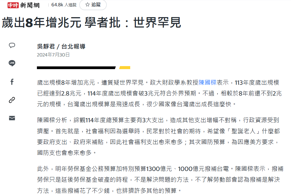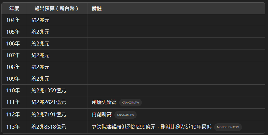 這是ChatGPT整理出來的近10年歲出的資料,前面幾年都算平穩,後面就算加上通膨,也不應如此的高。