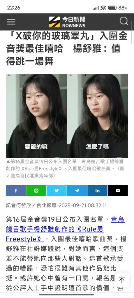 2025-09_要飯青鳥楊舒雅,這種歌可以得獎,淪落的台灣獎項 分類:Librapolitics_時光點評26 九月, 2025發表於時事政策,民進黨,不分類,人物標籤:青鳥,要飯,得獎,文化部,楊舒雅,民進黨 果然是個成功的要飯手,希望你終身都要飯順利。 但你的聲音絕不會是台灣的黃鐘之音。 分享此文: 分享到 Facebook(在新視窗中開啟) Facebook 分享到 X(在新視窗中開啟) X 更多 Share on LinkedIn(在新視窗中開啟) LinkedIn 分享到 Telegram(在新視窗中開啟) Telegram Email a link to a friend(在新視窗中開啟) 電子郵件 喜歡 正在載入... 相關 發表者:Librapolitics_時光點評 對於正義跟下一代的未來必須有堅持 檢視更多文章
